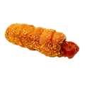 A deep-fried milk bun spiral wrapped around a whole sausage.